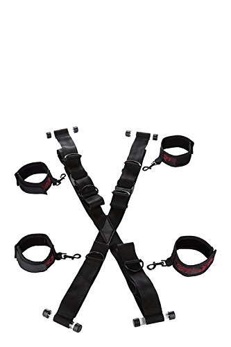 Fully adjustable to fit both standard and oversized doors;Sturdy straps and bar hooks for secure over the door placement;Includes totally adjustable and detachable universal wrist and ankle cuffs;Soft and plushy on one side, with designer fabric on the other;Universal clasps and D-rings with swivel design