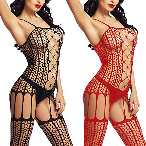LOVELYBOBO 2-Pack Damen Unterwäschen Reizwäsche Netz Strumpfhose Bodystockings Hohle Blumen Frauen Bodysuit Nachtwäsche Dessous (schwarz+rot)