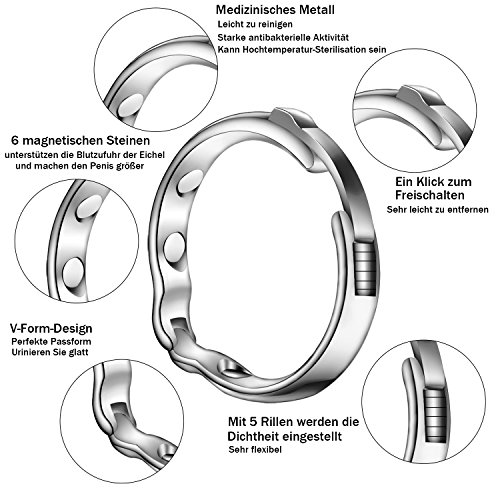 ★ Merkmale: Metall-Magnettherapie-Vorhaut-Blockier-Penisring. Penisring mit 6 magnetischen Steinen, unterstützen die Blutzufuhr der Eichel und machen den Penis größer. Es kann die Eichel aus der Vorhautabgrenzung ziehen, dann wird die Eichel einer Reibung unterzogen, welche immer stärker wird.
