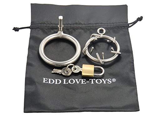 Original EDD LOVE-TOYS® CBT Peniskäfig „Pain“ Keuschheitsgürtel mit Spikes und Dornen Der Peniskäfig Pain bringt dem Keyholder völlige Kontrolle über dein Sexleben! Während ein normaler Peniskäfig dem Keyholder nur Kontrolle über deinen Körper gibt, lassen sich mit diesem Käfig auch deine Gedanken beherrschen! Jeder sexuelle Gedanke der zu einer Erektion führt wird sofort mit Schmerz bestraft. So wird der Slave trainiert nur noch an Sex zu denken wenn der Keyholder es gestattet. Pain ist geschmiedet aus hochwertigem, langlebigem Edelstahl. Für echte Genießer der CBT mit gehobenen Ansprüchen. Bei diesem bösem Toy ist dein Penis dem gnadenlosem Edelstahl 100%ig ausgeliefert. Durchmesser Hodenring: ca. 4,5 cm Durchmesser Penisring: ca. 4 cm Material: Edelstahl Farbe: Metall Andere Ringgrößen sind als Zubehör erhältlich (Artikelnummer 643). Wir empfehlen die Verwendung von Gleitgel und nach dem Liebesspiel die hygienische Reinigung mit unserem Lovetoy cleaner.