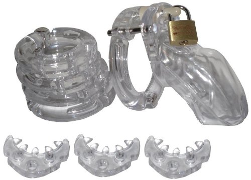 Durchsichtig. Inkl. Stacheleinlagen. Länge ohne Ring: 7,5cm. Innendurchmesser: 3,5cm. Inkl. Schloss mit 2 Schlüssel. Ringe mit Schanieren ausgestattet. Stacheleinlagen rausnehmbar. Stacheleinlagen in 3 Größen inklusive. Länge mit Ring – verstellbar von: 12,0 – 15,0cm. Vorne mit Öffnung zum problemlosen urinieren. Aus sehr hochwertigem, langlebigem Kunststoff. Mit dabei: 5 Hodenringe. Innendurchmesser jeweils: 1X 3,7cm 1X 4,0cm 1X 4,3cm 1X 4,8cm 1X 5,0cm