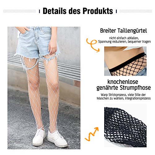 Schwarze Netzstrumpfhosen in 4 verschiedenen Maschengrößen von kleinen Maschen, mittelgroßen Maschen, großen Maschen und minigroßen Maschen, weiße Netzstrumpfhosen in 2 verschiedenen Maschengrößen von großen Maschen und kleinen Maschen, können Ihre verschiedenen Bedürfnisse zu erfüllen. Ca. 1 m in flacher Länge, Stretch-Taille ermöglicht es Ihnen, bequem zu tragen, bitte erlauben leichte Größenabweichung durch große Elastizität.