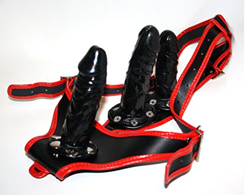 Bondage Umschnalldildo mit 3 Dildos. Alle abnehmbar zum reinigen. Maße der Dildos können Sie der Zeichnung entnehmen. Durchmesser der Dildos sind 3,5 cm Die Länge der Dildos sind: Vorne: 13 cm Lang Vaginaldildo: 13 cm Lang Analdildo: 9,5 cm Lang (Alles untereinander austauschbar. — Material: 100% Polyurethan