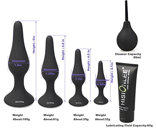 4 PLUG SIZES – Kleine 4 x 1 Zoll – Medium 4,5 x 1,12 – groß 5,5 x 1,5 – XLarge 6 x 1,5;Paket beinhaltet Klistier 89ml schwarz.