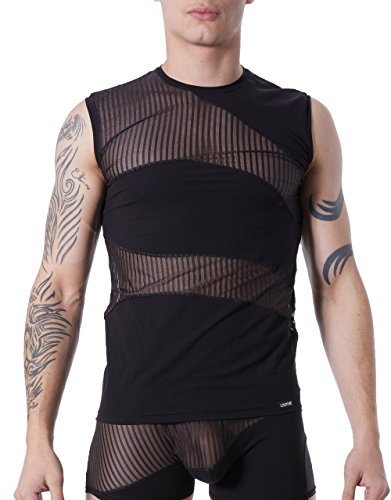 Der weich und den Komfort sind die Schlüsselbegriffe für dieses Shirt sexy schwarz. Eine Form der Tank Top Rundhalsausschnitt ohne die Griffe geht es auch sowohl in Unterwäsche als T-Shirt. Dieses Shirt Tank Top Schwarz vermischen sich zwischen Qualität: Blickdichter Stoff und transparente Partien sowohl vor als auch hinter. Die transparente Partien sind fein gestreift in einer Weise sehr glamour.
